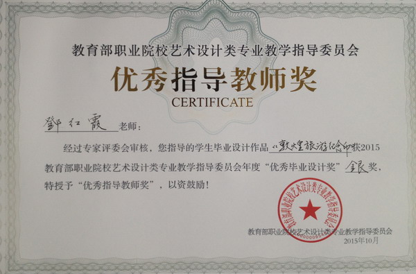本届年会还分享了年度毕业设计作品奖评选成果,美术学院选送的由邓红霞老师指导,师如杰同学作品《敦煌旅游纪念币设计》获得2015教育部职业院校艺术设计类专业教学指导委员会“优秀毕业设计奖”银奖;李艳老师指导的师如杰同学另一件作品《福牛系列旅游纪念品设计》获得“优秀毕业设计奖”优秀奖;赵继荣老师指导的方文同学作品《雨点咖啡形象设计》获得“优秀毕业设计奖”优秀奖,同时邓红霞老师获得“优秀指导教师奖”。