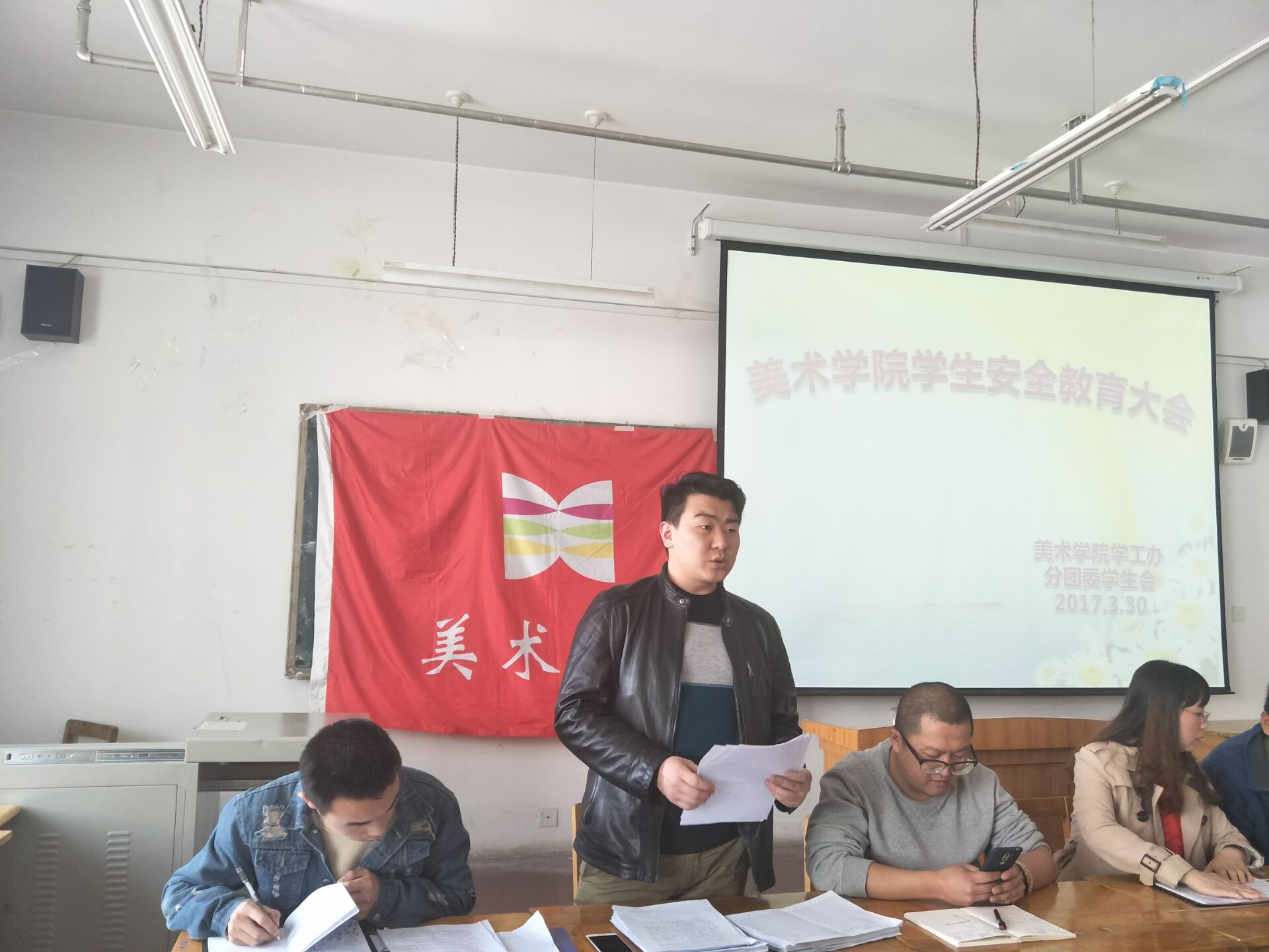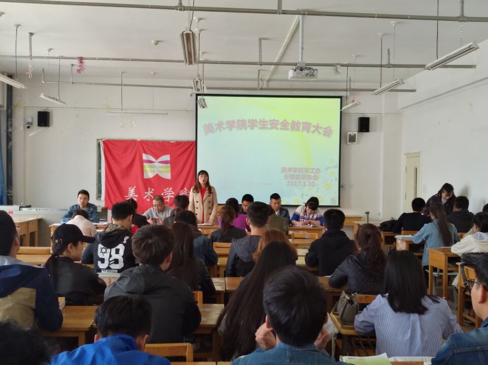 为了进一步加强学生节假日安全防范意识,提高学生自我保护的能力,2017年3月30日中午,美术学院在1#604召开“清明节”节前安全教育大会,会议由学工办主任唐艳丽老师主持,美术学院辅导员匡扶老师、郭子弘老师以及学生会成员、各班班干部50多人参加了会议。