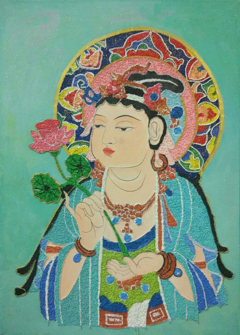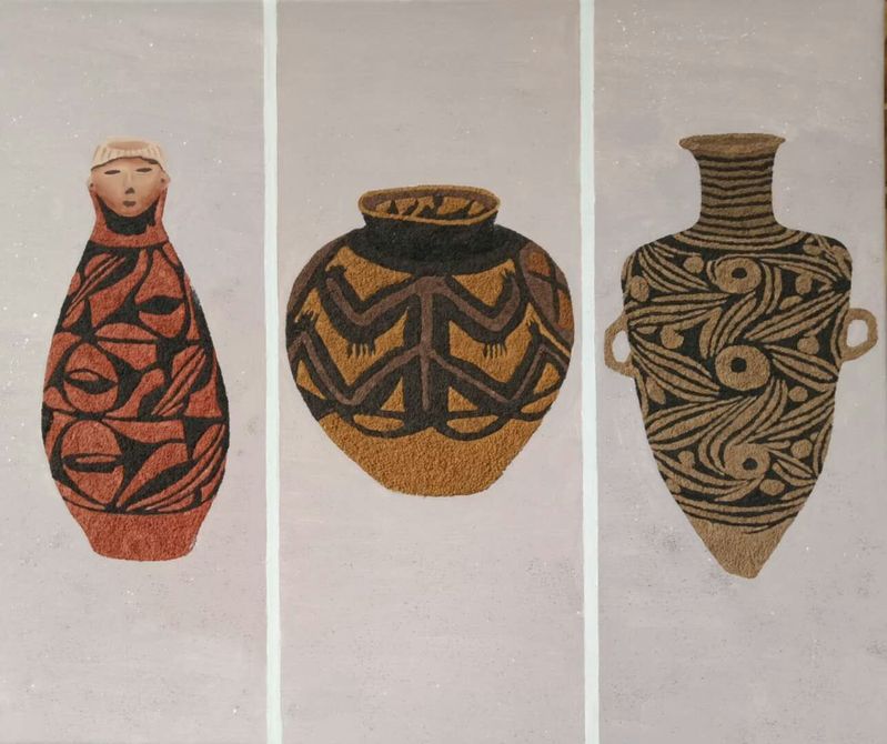 在该课程的教学过程中,王亦慧老师带领同学们从敦煌壁画、甘肃彩陶等我省经典文化入手,认真组织研习。师生们依托研习成果,大胆运用新型材料进行创作,将教学任务融入创作活动,全面调动同学们的创作热情,整个教与学的过程积极向上且富有激情,产生了一批优秀的作品。从大地湾彩陶到敦煌壁画再到现代装饰画,同学们从经典传统文化中汲取了丰富的艺术营养,沉浸于艺术的传承又勇于突破和创新,实现了将中国传统文化融入课程建设的有效探索。