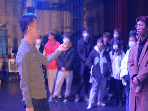 演出前,缪老师与同学们一起交流和探讨了舞台灯光设计的相关专业知识,给同学们介绍了剧场各个部位的功能和观演之间的关系,参观了灯光控制台、各类舞台灯具等设施设备,为同学们上了一堂形象生动的舞台认知课。通过现场教学使同学们明白了一个道理,学习灯光设计并不仅仅只是简单学习控台、了解灯具等技术层面,不是炫技,是思想的碰撞,灯光设计的意义在于为表演锦上添花,只有真正了解表演内容才能设计出优秀的灯光效果,才能使同学们成为合格的灯光设计师。