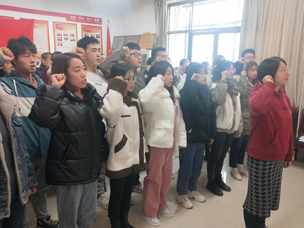 仪式开始由副院长李富红为大家介绍新葡萄官网2020年发展对象的个人情况,并宣布同意石千等7同志为预备党员的决定,仪式在庄严的《国际歌》中拉开序幕,首先由学生支部书记为新发展的预备党员佩戴党徽,紧接着由新葡萄官网学生第二党支部书记万婷带领预备党员宣誓,全体党员佩戴党徽,举起右拳重温入党誓词。