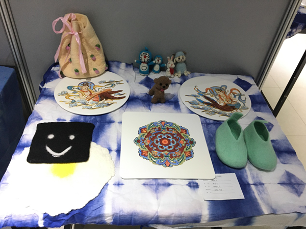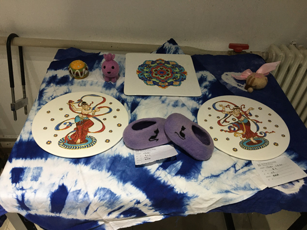 此次共展出扎染作品四十余件、手工毛毡作品二十余件以及掐丝作品二十余件,种类丰富,形式多样,包括扎染挂画、毡画、毡垫、毡包、毡帽、玩偶、掐丝盘子等。同学们的扎染作品色泽明快,图案简洁质朴,花纹呈现出独特的晕染效果,自然天成;手工毛毡作品材料温暖舒适、外观拙朴细腻,风格清新朴实;掐丝作品色彩艳丽,线条流畅细腻,无论是佛像或是飞天都生动自然,栩栩如生。