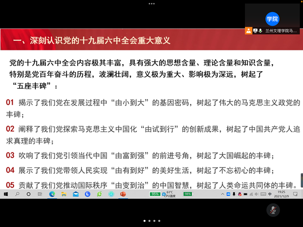为深入学习宣传党的十九届六中全会精神,深入推进党史学习,深刻把握党百年奋斗的初心使命和重大意义,12月9日晚7点-9点,新葡萄8883官网amg党总支特邀马克思主义学院孙红英教授为2018级和2021级在校生开展关于十九届六中全会精神学习的专题讲座,共计300余人参加学习。