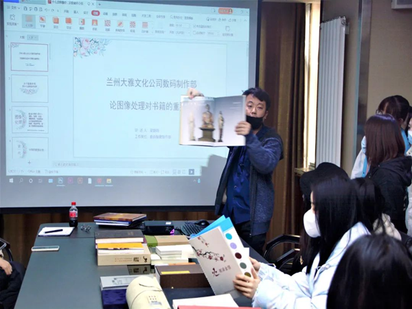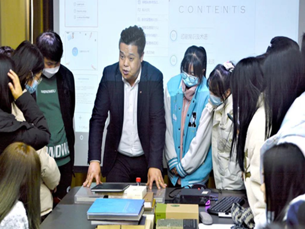 培训期间,大雅文化公司的员工将多年积累经验、专业及艺术感悟分享给同学们。业务部经理杨得宏就印刷方面的印刷常识、工艺、误区为同学们进行了讲解;经理马德军为同学们带来了以“一本书的诞生”为主题的系列课程培训,课程培训精彩、幽默、风趣,赢得了同学们的一致好评;调色师梁剑鸣就“图像处理对印刷品的重要性”进行实例分析和详细讲解,并分享了自己职场上的工作经验。最后,同学们翻阅国际获奖书籍、国内高端书籍作品,参观公司先进专业色彩管理系统和硬件设备,期间就印刷新工艺技术和材料与设计人员进行交流互动。