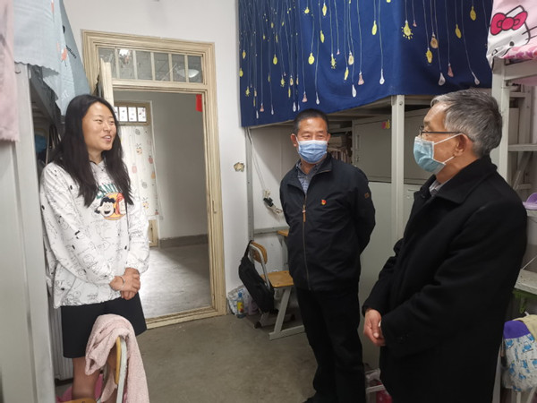 随后李敏骞分别走访了6号学生公寓经济管理学院学生宿舍。所走访的宿舍都是毕业生宿舍,宿舍里大家都在宿舍认真修改论文、看书复习、准备公考。李敏骞详细了解了同学们的就业情况、考研情况和下一步的工作打算。李校长和同学们亲切交流,对同学们面对疫情从容应对的心态感到欣慰,当问到同学差一点上国家线时,李校长贴心说考研不是唯一的出路,希望同学们结合自己的实际调整好工作目标,鼓励同学们正视挑战,多手准备,调整情绪,迎难而上。