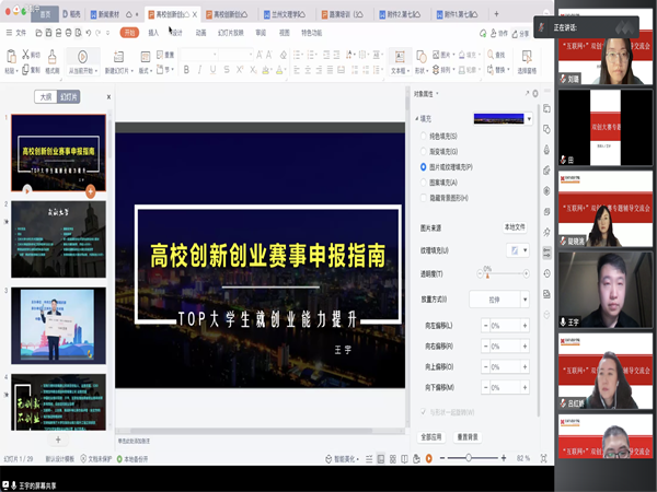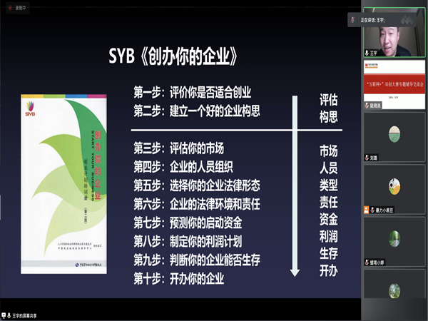 为进一步推动我院创新创业工作的发展,培养和提升广大师生的创新意识、创造精神和创业能力,同时做好“互联网+”创新创业大赛组织工作,学院于3月29日晚19:30邀请兰州大学信息学院全球校友会副秘书长、人社部中国创业培训项目培训讲师王宇老师,通过腾讯会议的形式线上为全体老师做了赛事专题培训。会议由副院长仇宇主持。
