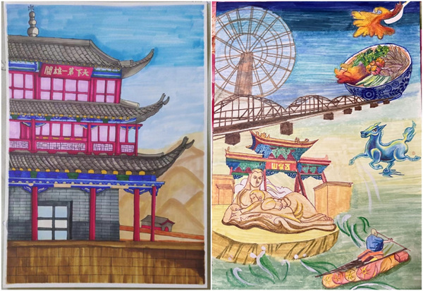(图片为2021级视觉传达设计2班姚子涵作品《天下雄关嘉峪关》,2021级绘画专业杜雅凡作品《古城兰州》)