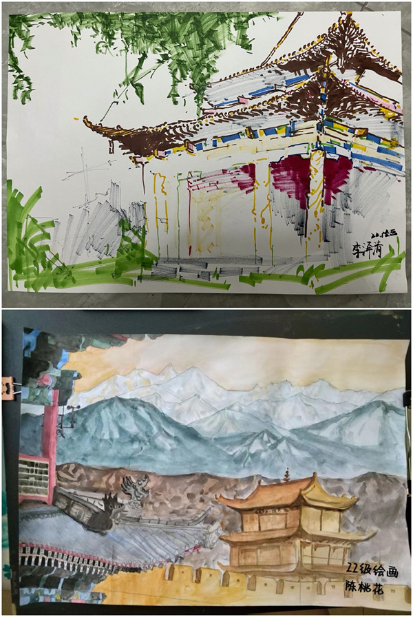 图片为2022级绘画专业李泽清作品《绘美凉州---鸠摩罗什寺塔一角》,2022级绘画专业陈桃花作品《天下第一雄关嘉峪关》)