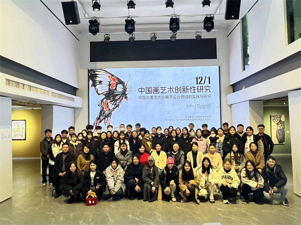 为熏陶设计专业学生的艺术素养,开拓同学们的设计思维能力,12月1日下午,新葡萄8883官网amg视觉传达设计专业30名同学到兰州文创产业园A9美术馆聆听了当代彩墨艺术家马媛媛老师关于《中国画艺术创新性研究》的讲座,并现场观看了马媛媛老师的个人绘画作品及《化蝶》系列相关文创产品。