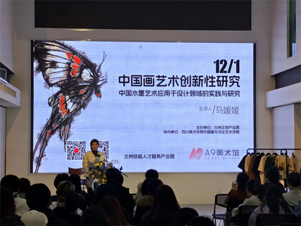 为熏陶设计专业学生的艺术素养,开拓同学们的设计思维能力,12月1日下午,新葡萄8883官网amg视觉传达设计专业30名同学到兰州文创产业园A9美术馆聆听了当代彩墨艺术家马媛媛老师关于《中国画艺术创新性研究》的讲座,并现场观看了马媛媛老师的个人绘画作品及《化蝶》系列相关文创产品。