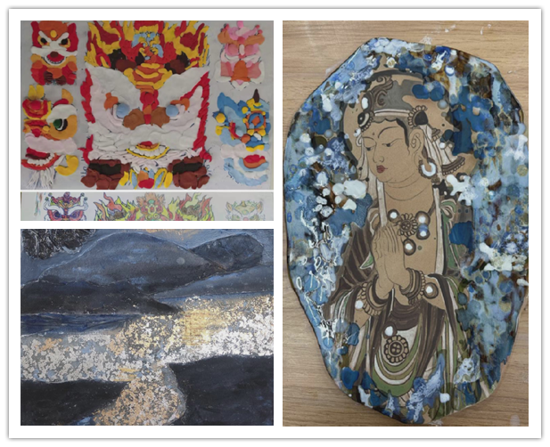 综合材料绘画,总体上可分为平面类和立体类,平面类大致可分为:废旧利用类、刻纸剪贴类、综合造纸术、版画结合、水拓画等;立体类分为:浮雕类、泥塑类、纸塑类、废物拼装、立体布艺等。在审美日趋多元的当下,材料实验已经成为艺术家不可或缺的基本素养,此次综合材料绘画课程开课以来同学们热情投入到材料的寻找与实验之中,尝试各种可能,在材料组合与制作中不断有新发现,有新的创作灵感产生。材料具有当下性,唯一性,材料的介入同时也会打破我们观念中的确定性,迫使我们面对当下进行新的思考与尝试。材料引入增加了同学们艺术学习新的可能性,是一次心灵的激荡与冲击。该课程的学习能够培养学生的创造性思维能力,通过动手制作掌握材料的基本属性、造型原理和艺术技巧。