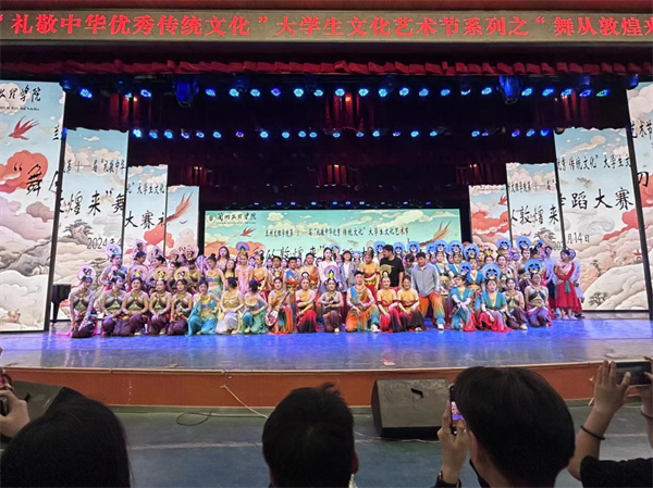 新葡萄官网的节目《飞天一梦,千年敦煌》由分团委组织学生会选拔,由赵珈敏、王毅、温潇琳、马潇之、浪艳茹等12个人参加比赛,比赛中新葡萄官网舞蹈团队为在场的老师和同学们奉献了一场视觉盛宴,同学们的舞蹈或委婉柔美,意境悠远,或大开大合,动感十足,现场观众掌声不断。