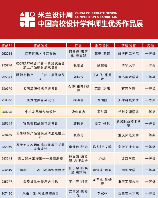 “米兰设计周·中国高校设计学科师生优秀作品展”大赛是中国高等教育学会发布的《全国普通高校学科竞赛排行榜》内榜单项目,今年特别增设了“设计赋能‘土特产’,助力乡村振兴”公益赛道。新葡萄官网历来注重设计的社会服务功能,特别是设计赋能乡村振兴。此次大赛,邓红霞教师指导的2021视传2班学生沈年育鑫设计的作品“牛小友品牌包装设计”获得全国大赛一等奖、21视传1班陈玉同学的设计作品“‘同源记’甘肃中医药品牌包装设计”获得全国大赛三等奖,樊华教师指导的贾彤辉同学设计的作品“甘肃平凉红牛IP形象设计开发及应用”获得全国大赛三等奖。