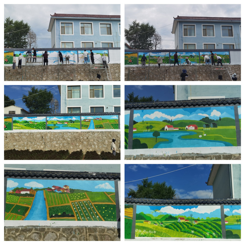 本次活动围绕“美丽哈班岔 环境美如画”、“多彩梯田 丰景如画”、“高原夏菜 丰收在望”、“露营康养 天然氧吧”四个主题,同学们在2米高的脚手架上作画,要在长度55米,高度1.8米的墙上,绘制完成长度为4米的画作12幅。