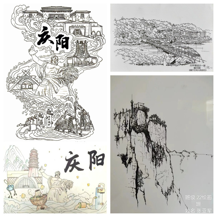 (图片为22级环境设计专业王子怡、李卫娟作品《庆阳印象》,22级环境设计专业柳兴阳作品《属于兰州人的回忆》,22级绘画班张亚军作品《陇南陈县鸡峰山》)