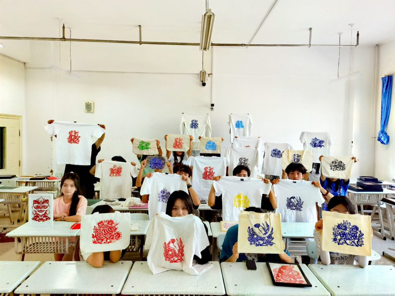 在剪纸新材料应用方面,唐老师购置了剪纸转印纸,选择传统十二生肖图案,让同学们将刻制好的十二生肖通过热转印,印制在白色短袖、帆布包包上,一件件古朴端庄栩栩如生的剪纸文创作品应用而生,同学们在一方文创实物上实践了传统与创新的结合。