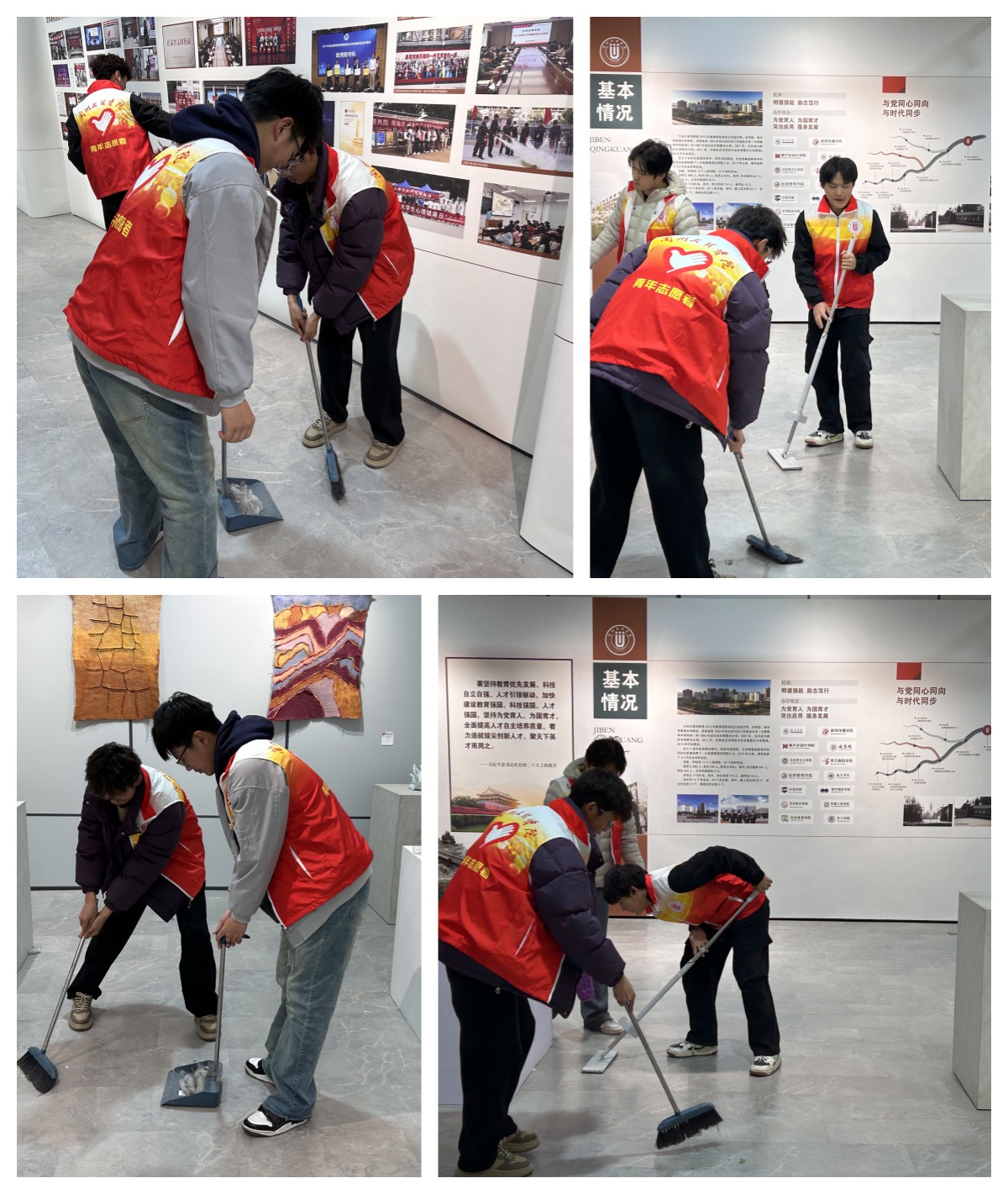 活动中,同学们热情高涨,干劲满满,积极投身到清扫工作中。大家依据事先规划好的任务安排,分工明确,配合默契。负责地面清扫的同学紧握扫帚,一丝不苟地将灰尘与杂物聚拢成堆;擦拭展台的同学则拿着抹布,反复擦拭,不放过任何一处污渍,同时对展品的摆放角度进行微调,使其在展台中呈现出最佳展示效果;清理角落的同学更是耐心细致,将那些平日里容易被忽视的卫生死角彻底清理干净。他们认真专注的神情、全身心投入的姿态,淋漓尽致地展现出当代大学生志愿者积极服务、无私奉献的精神风貌。