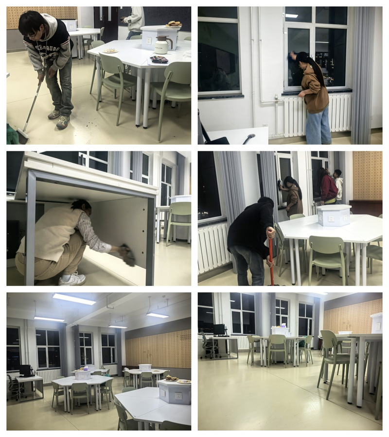 作为活动的重要环节,24视传的同学们在整理师的带动下对715教室进行深度清洁与整理。师生分工协作,分别对桌面、立面和家具物品三大类空间和对象进行了深度清理:彻底清理地面垃圾、桌面灰尘及窗户死角,将教学用具、学生作品分类存放。